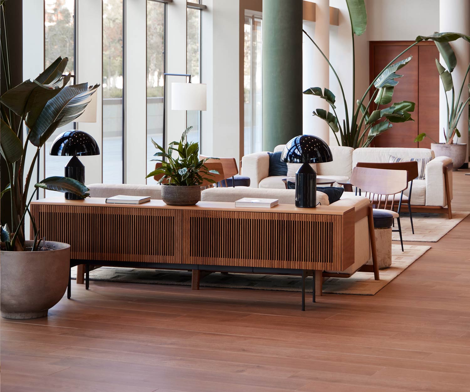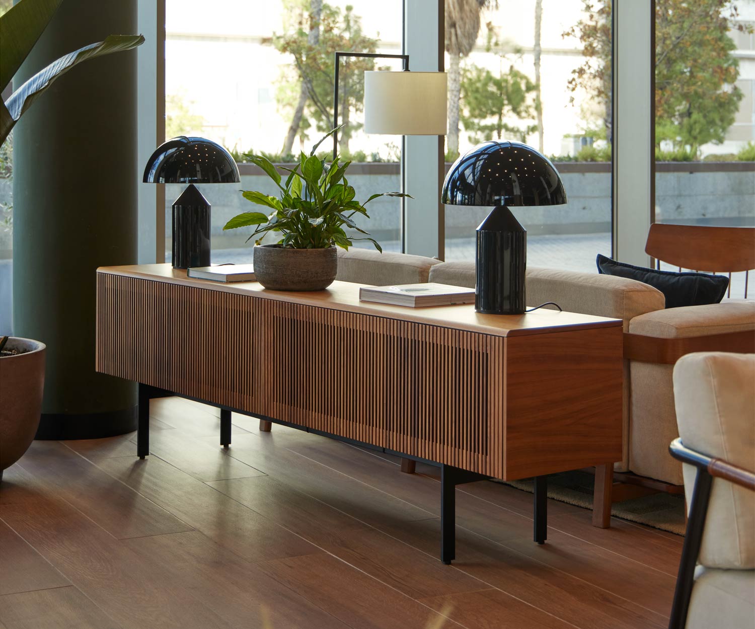 Le corps et les portes abattantes du buffet TV design Malmö Punt sont composés de panneaux MDF E1 et de panneaux de particules E1. Ceux-ci sont plaqués soit avec du noyer , soit avec du chêne. Les lamelles des portes abattantes sont en bois massif. Les panneaux de finition en option sont laqués en or ou en bronze métallisé sur demande. Le corps repose sur un socle en acier avec des pieds revêtus par poudre.