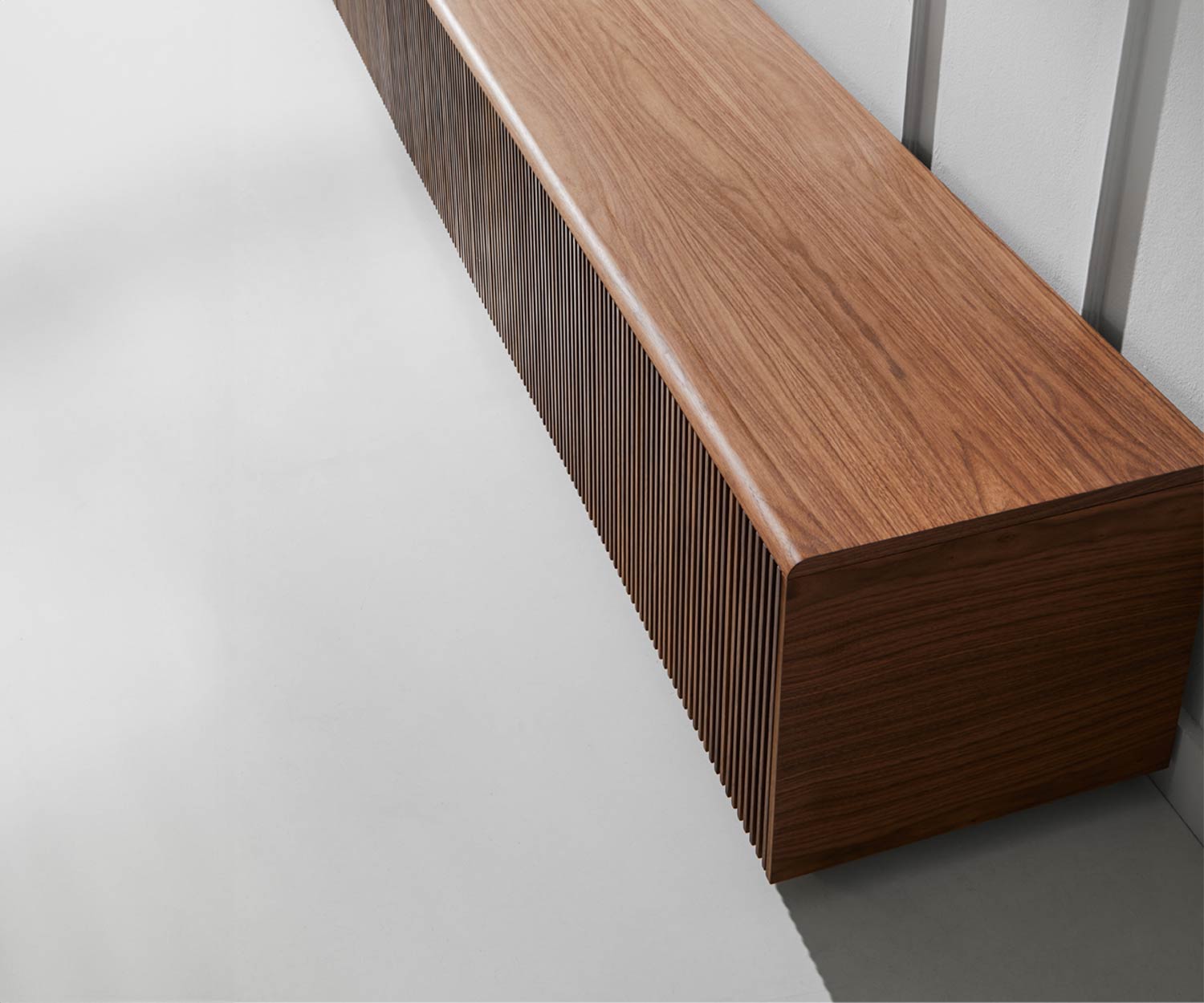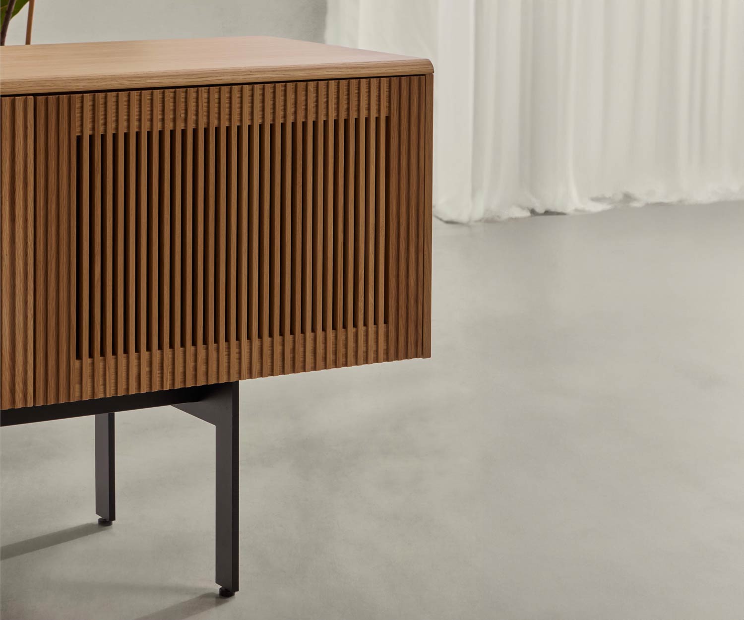 Le meuble bas TV design Punt Malmö fait partie d'une série de fabricants très particulière, conçue par Mario Ruiz, qui se caractérise par des formes simples associées à des matériaux de haute qualité. Outre les lamelles verticales de la partie frontale en accordéon, on remarque également les plaques de recouvrement incroyablement fines et brillantes disponibles en option. Il convient également de mentionner les bords avant arrondis au-dessus des portes abattantes, le beau veinage du placage et les pieds fins ou les pieds de table. le socle.