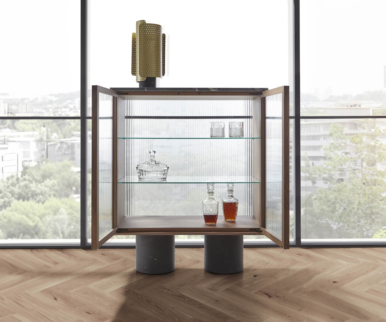 Le sideboard Punt Rio crée un contraste avec son design particulier. crée un contraste chez l'observateur. D'un côté, il y a les deux pieds massifs Les colonnes de pieds, synonymes de stabilité et de majesté. D'un autre côté, les armoires représentent Les armoires qui les surmontent représentent la précision et la finesse. Les cadres en bois élancés autour des des portes en verre forment une sorte de pont entre les deux lourdes colonnes. colonnes.