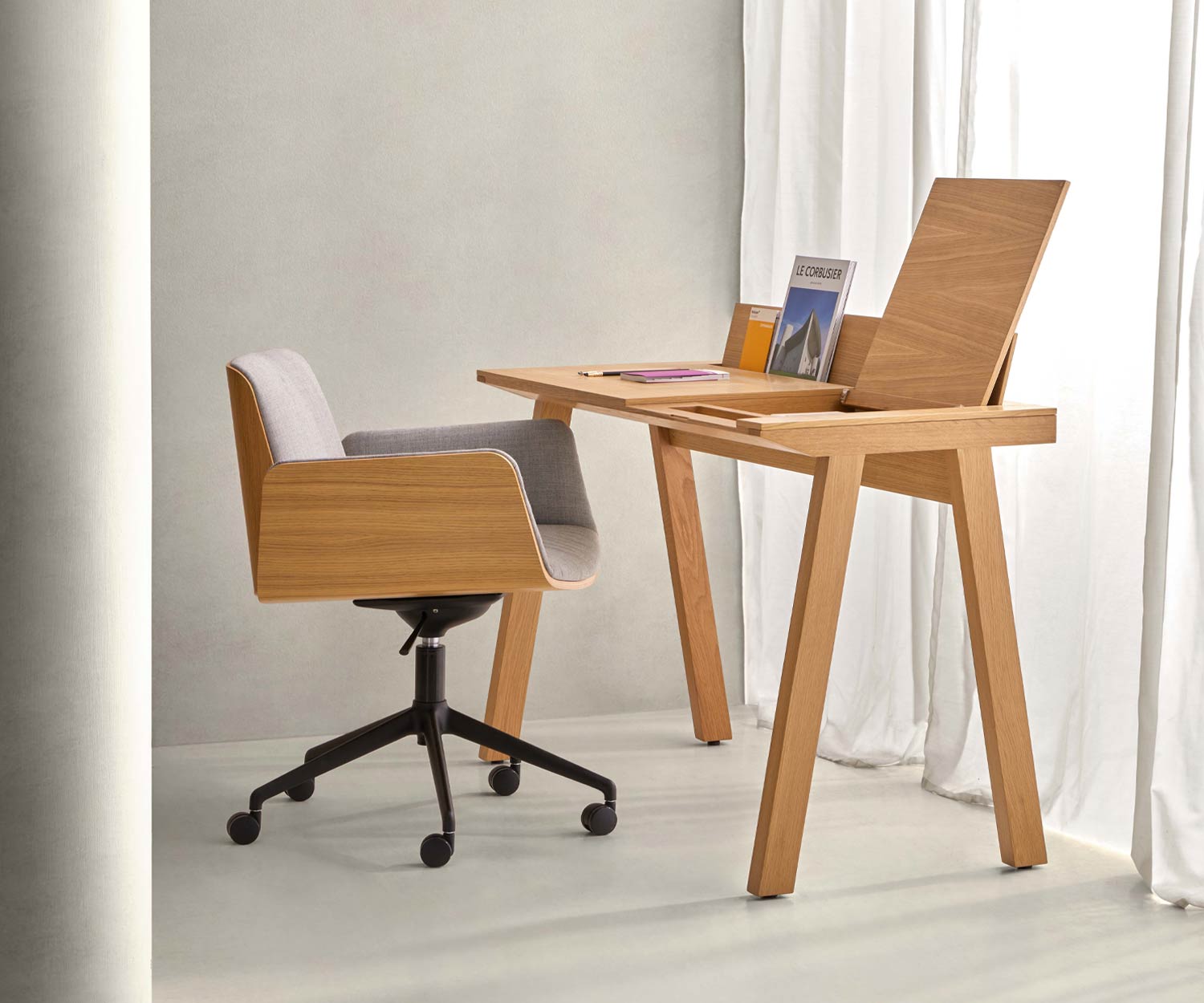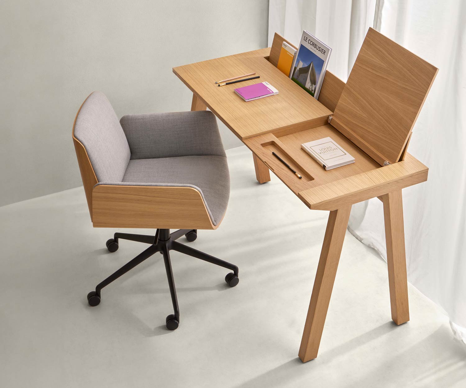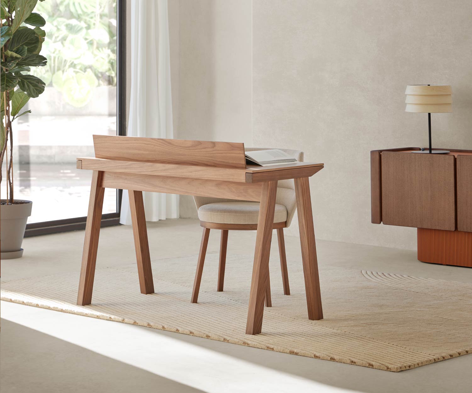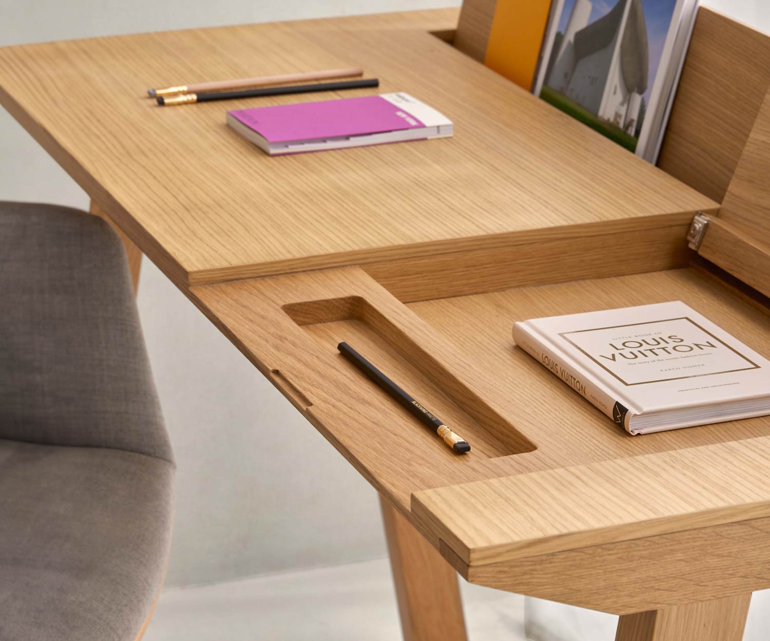 Secrétaire design unique Ernest de Punt d'Espagne. Le design moderne assure une présence intemporelle et permet d'intégrer facilement le bureau dans chaque pièce. La structure est fabriquée en chêne massif ou en noyer. Le plateau de table possède un compartiment caché pour les petits ustensiles. À l'arrière se trouve un support pratique qui peut être utilisé pour les tablettes, les documents ou les notes. Un système de gestion des câbles intégré permet de faire passer les câbles du pied au plateau de manière invisible.