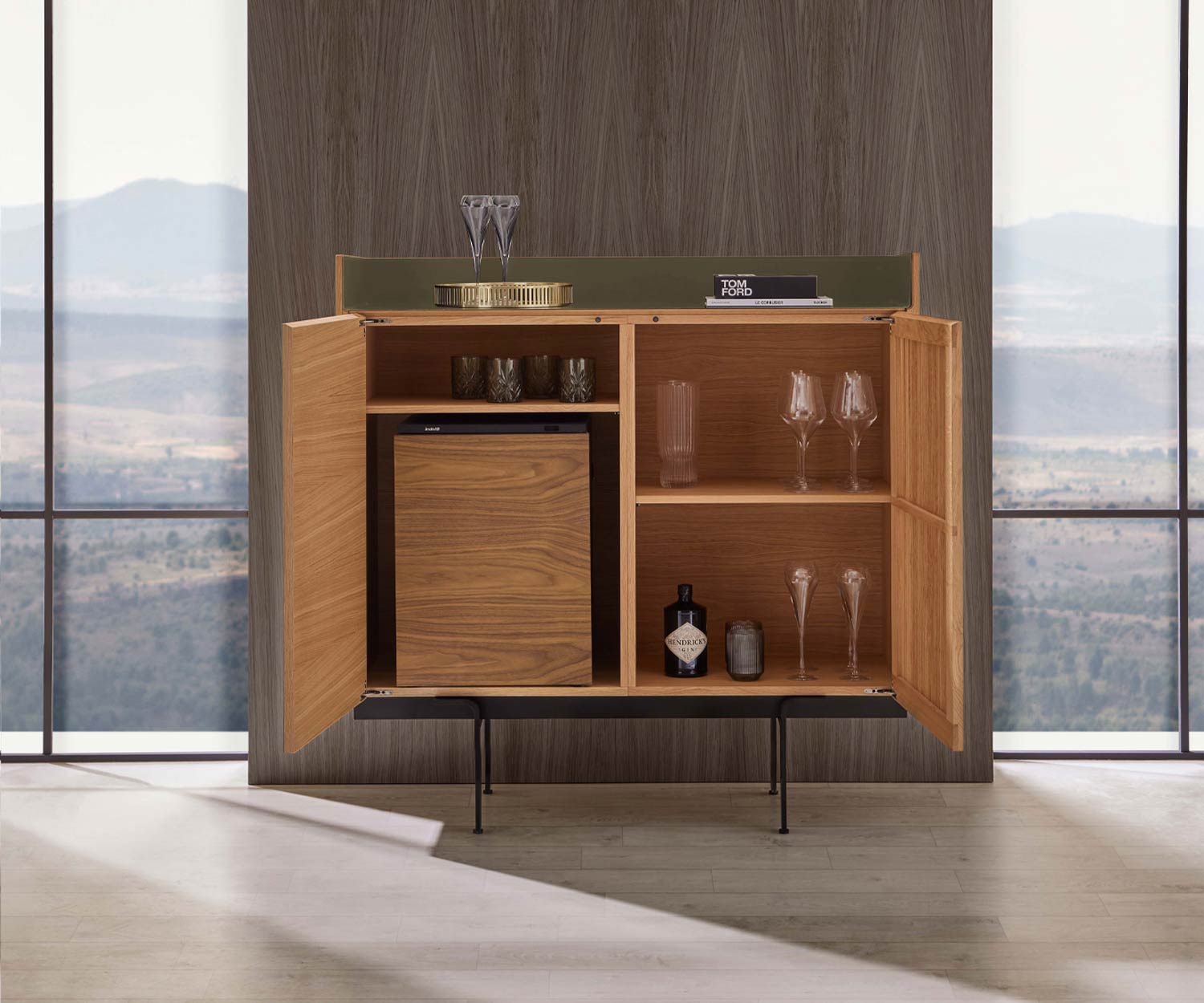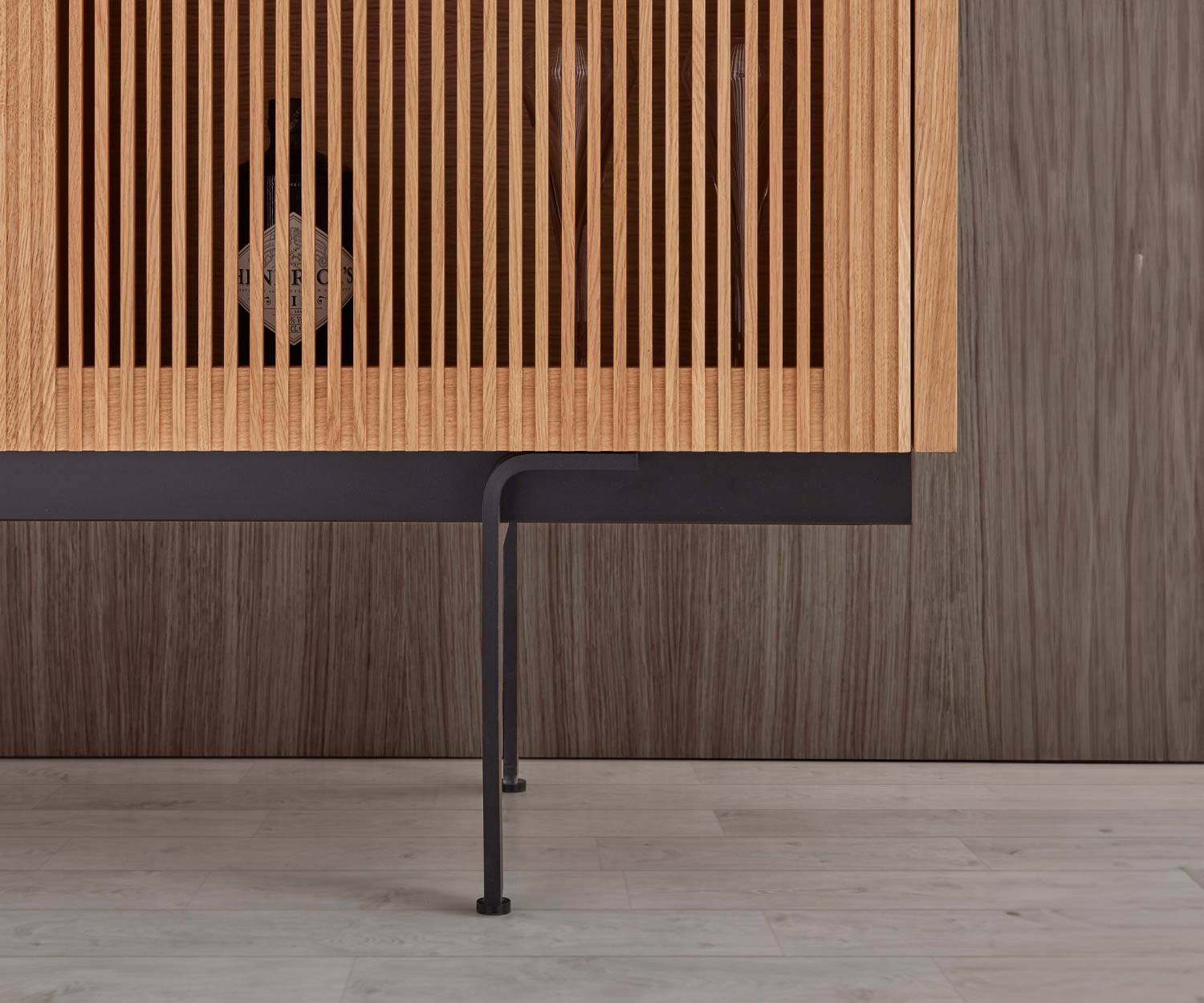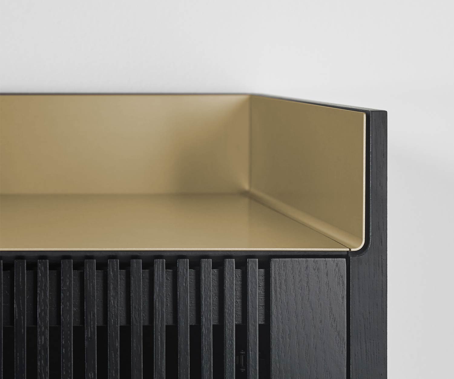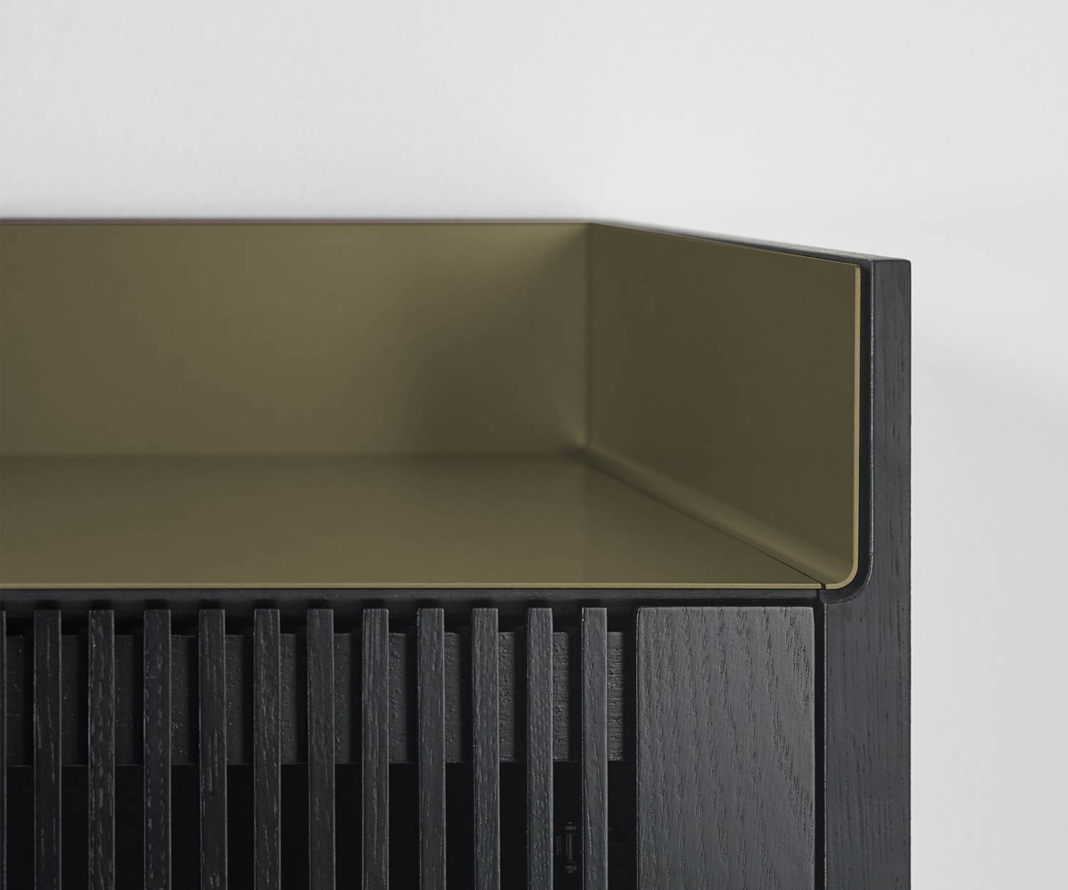 Le panneau de finition est disponible en aluminium doré, aluminium bronze et aluminium rose. Le corps et la façade sont disponibles en chêne super mat, en noyer super mat ou en chêne teinté foncé (Stained Oak Ebony). Les pieds sont disponibles en noir RAL9005.