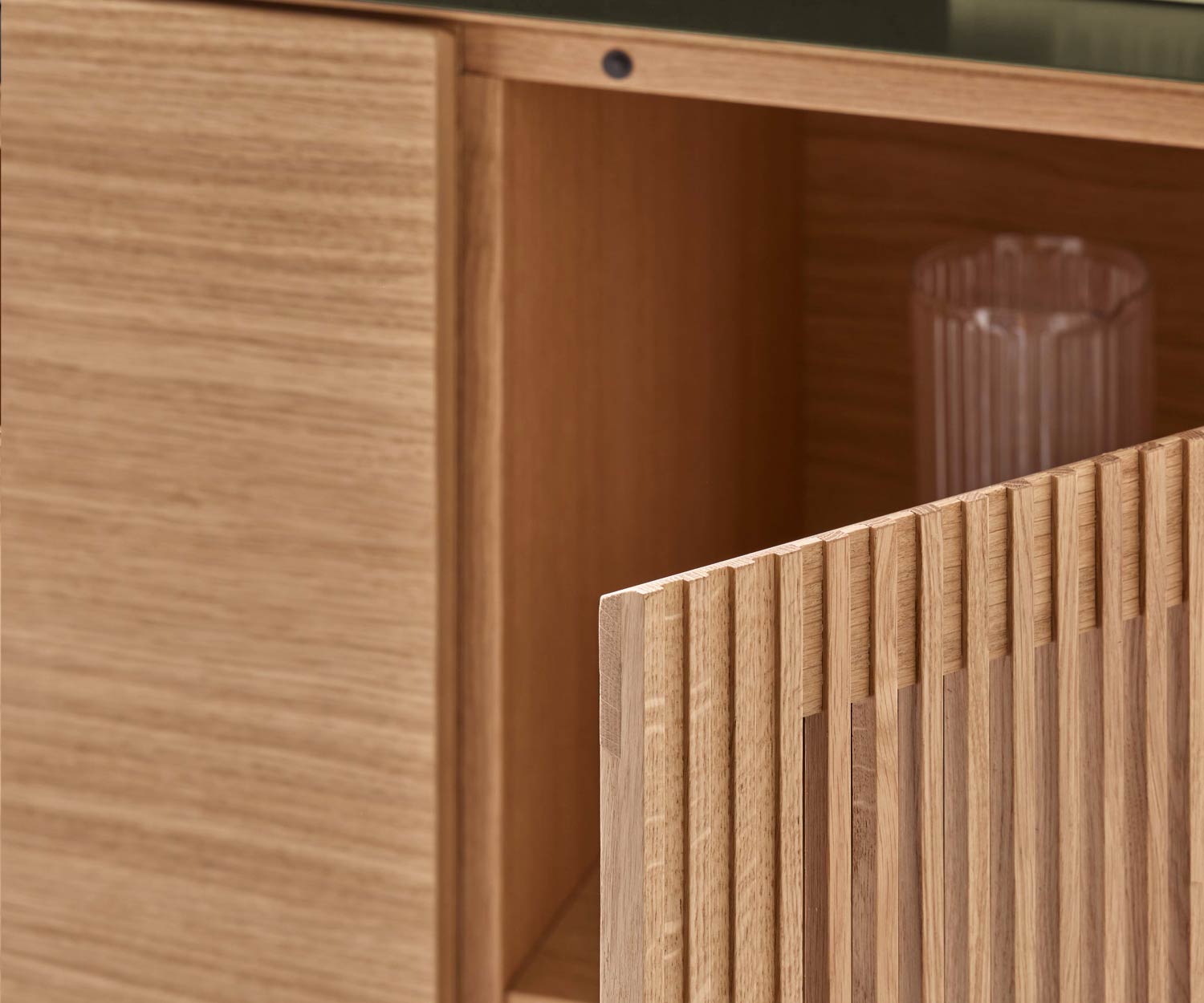La partie intérieure et extérieure du highboard Stockholm Punt est composée de panneaux MDF E1 et de panneaux de particules E1. Ceux-ci sont plaqués en chêne ou en noyer et présentent un placage continu revêtu. La finition du plateau de finition est en aluminium anodisé. La porte de droite est, comme mentionné, plaquée en chêne ou en noyer, mais les lamelles utilisées sont en chêne ou en noyer massif. Le corps repose sur un socle en acier avec des pieds revêtus par poudre.