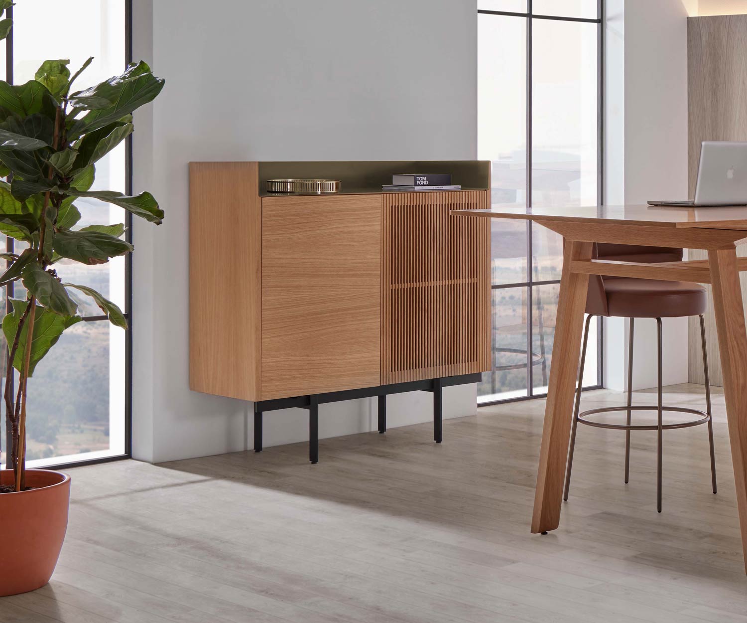Que ce soit dans la salle à manger ou dans le salon, ce buffet haut design Punt Stockholm HiFi embellit chaque appartement moderne avec sa porte droite à lamelles en style accordéon. Sa finition en aluminium pour le panneau de recouvrement particulièrement fin apporte de l'éclat aux yeux de l'observateur. Et l'amateur de stéréo peut se réjouir d'une trappe où il peut habilement dissimuler les câbles encombrants de ses appareils audiovisuels aux regards des visiteurs.