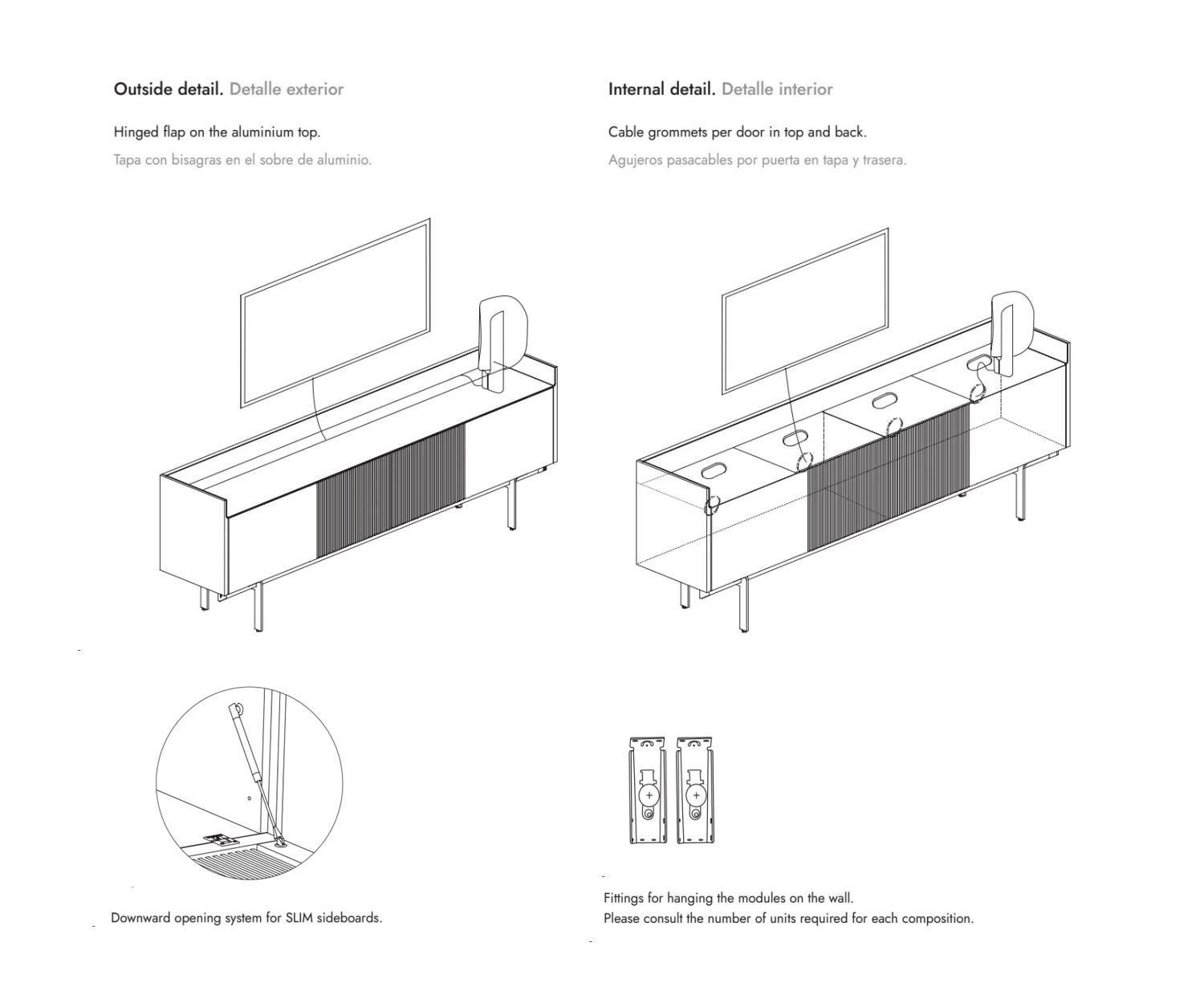 Au centre, sous le volet, se trouve un accès à l'intérieur qui permet de connecter les appareils du lowboard à la télévision qui se trouve dessus. Deux passages de câbles dans le panneau arrière permettent d'alimenter facilement le meuble en électricité.