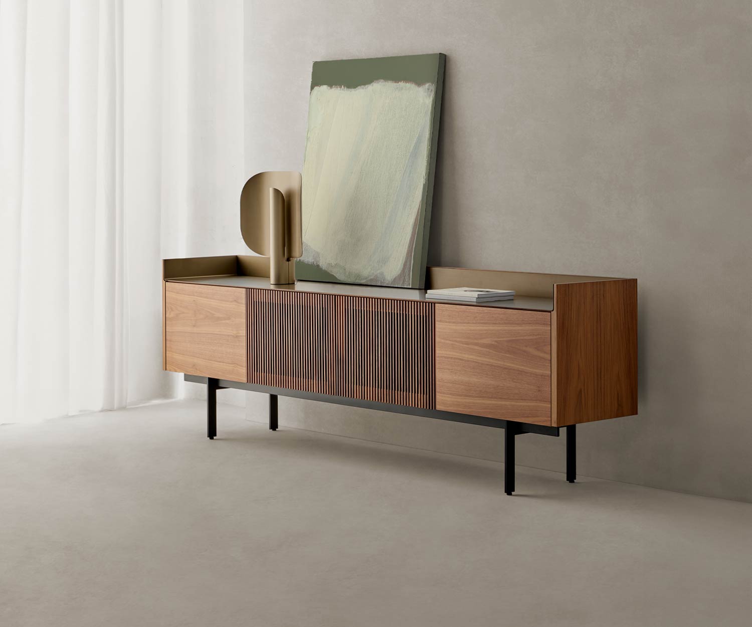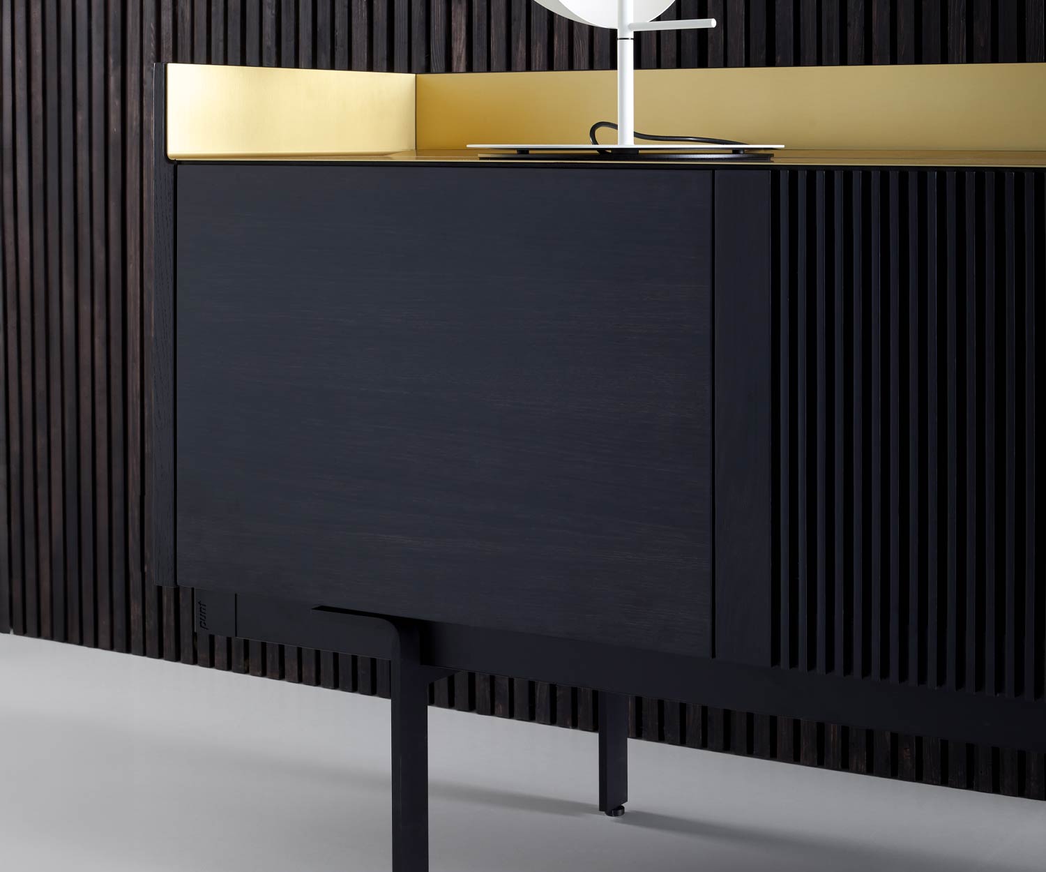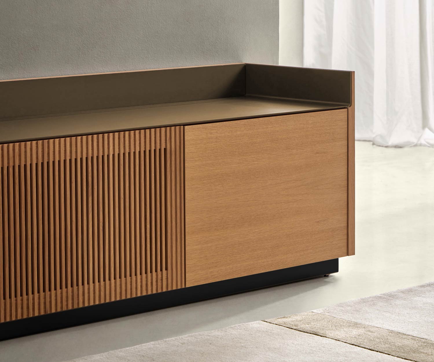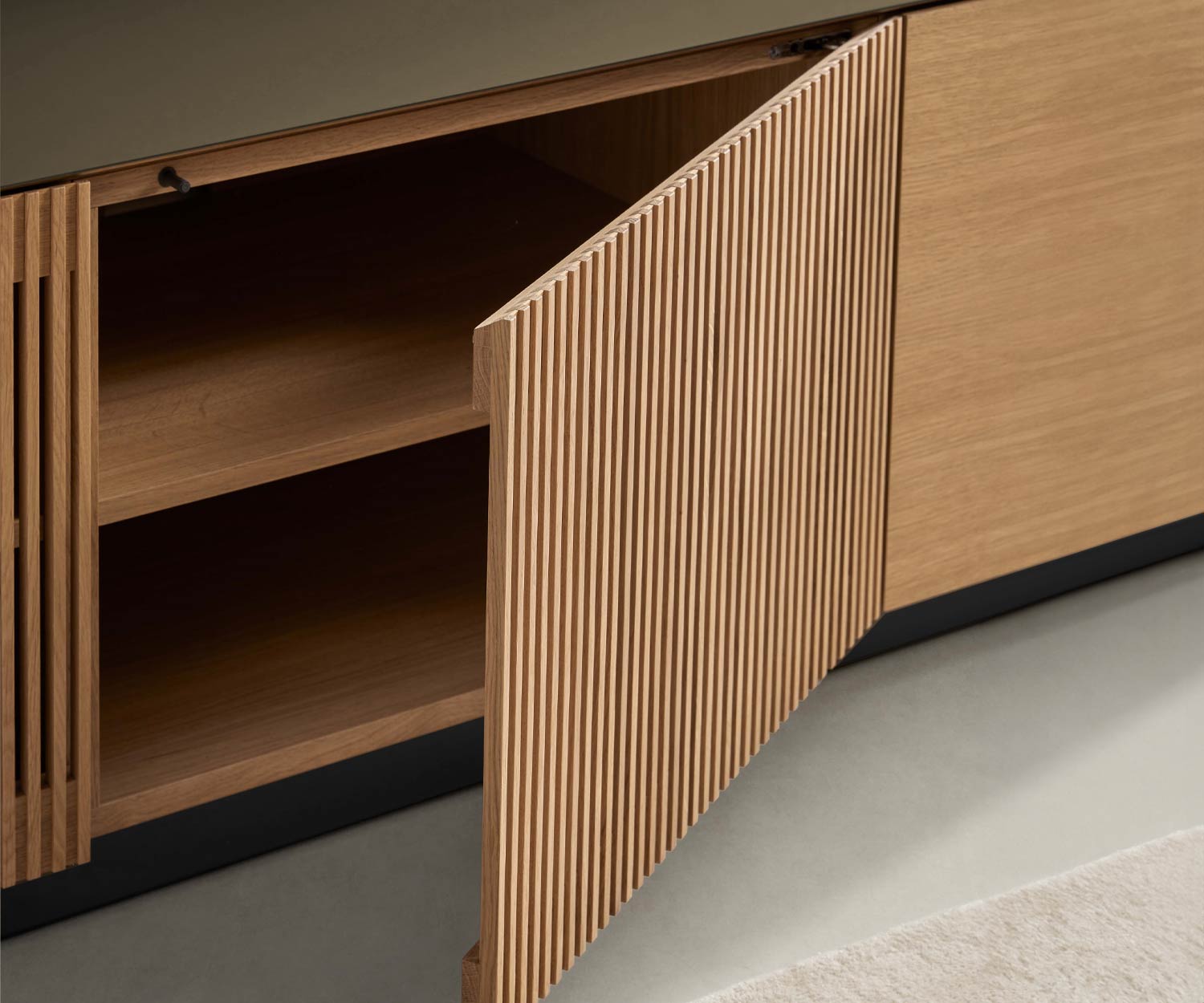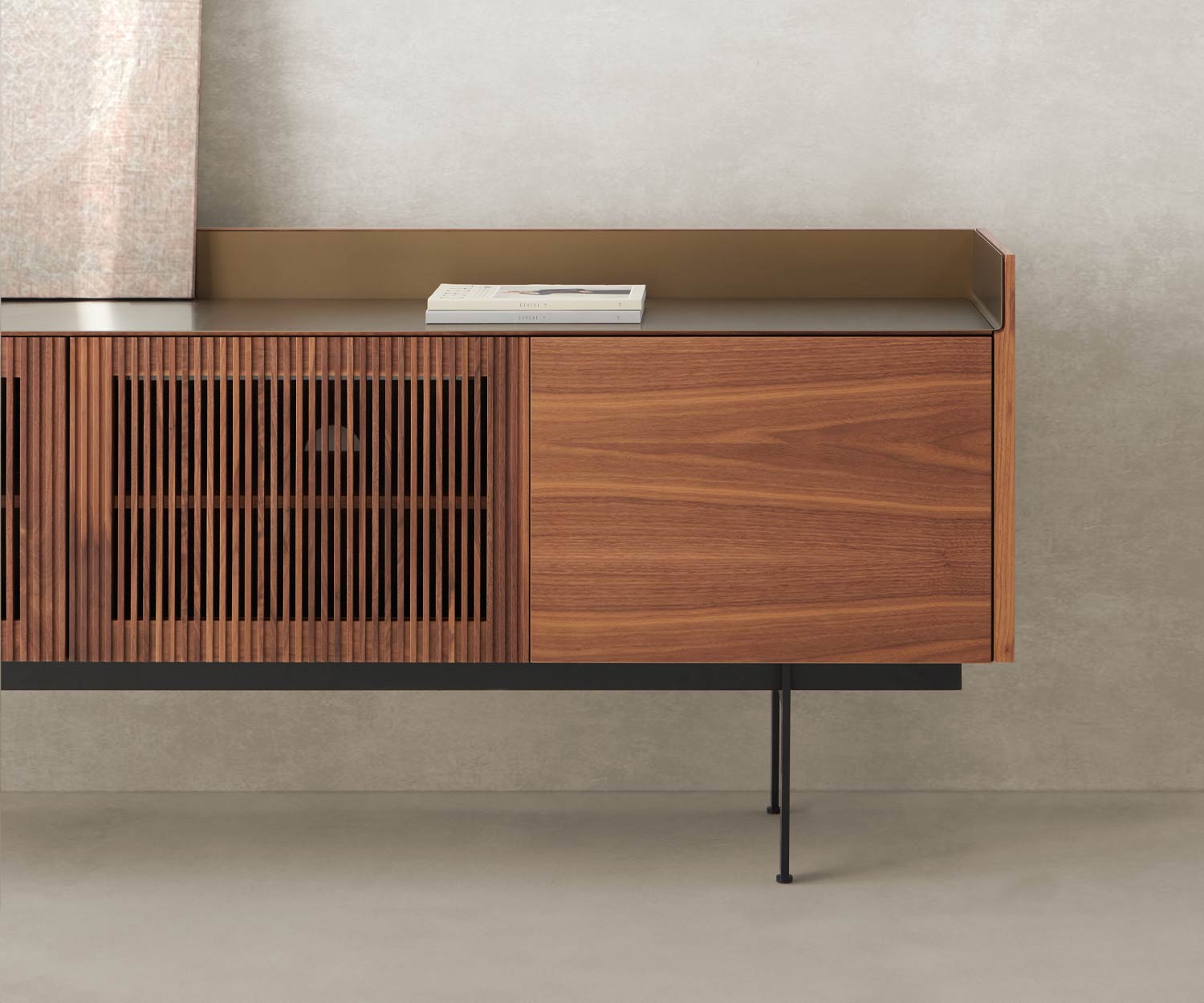 Le corps et les portes fermées sont en MDF E1 stable et en panneau de particules E1 (faible teneur en formaldéhyde). Ces derniers sont ennoblis par un placage en bois véritable . Nous veillons à ce que le placage s'étende sur toutes les portes et ne soit pas interrompu. Les portes à lamelles sont en bois massif de chêne ou de noyer, selon la version. Le plateau de finition est en aluminium laminé et anodisé. Les pieds en option sont constitués d'un socle en acier avec une surface thermolaquée et structurée.