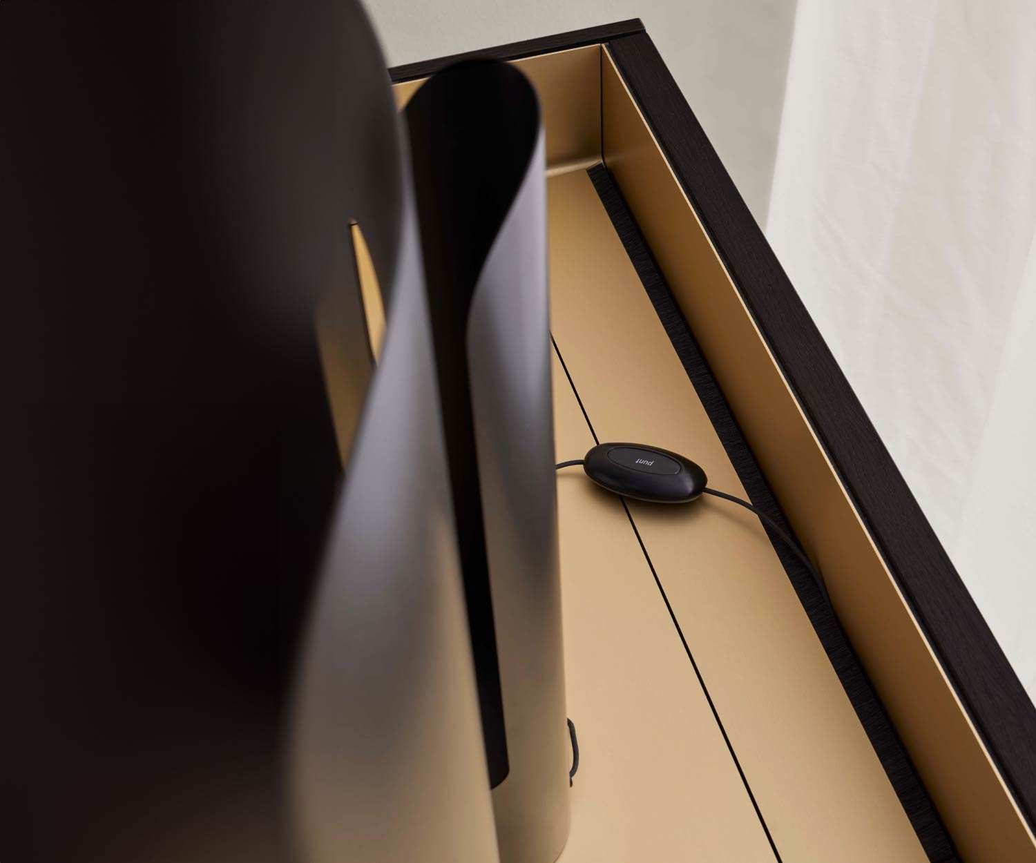 Le lowboard Stockholm dispose de deux portes à lamelles perméables aux infrarouges, derrière lesquelles les appareils électroniques peuvent être facilement commandés. De plus, les lamelles contribuent à un échange de chaleur optimal. Sur le plateau de finition se trouve un grand volet en aluminium qui peut être relevé si nécessaire pour ranger les câbles et les blocs d'alimentation. Une bordure en soie laisse passer les câbles et protège de la poussière. Au centre, sous le volet, un accès à l'intérieur permet de relier les appareils du lowboard à la télévision placée dessus. Deux passages de câbles dans le panneau arrière permettent d'amener facilement le courant dans le meuble.