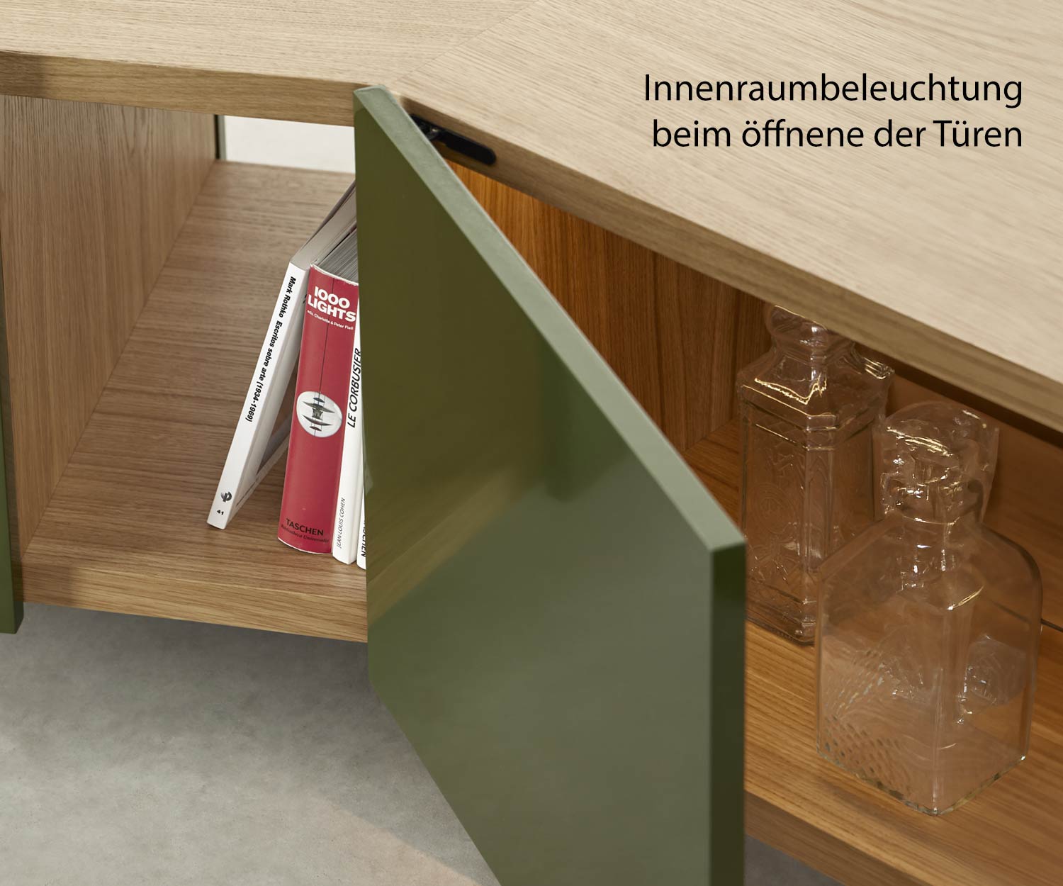 Conçu comme un sideboard d'angle, il offre des portes sans poignées qui s'ouvrent à un angle de 90 degrés. Les pieds réglables en hauteur permettent une adaptation flexible à chaque sol. Un éclairage intérieur à LED (2.700 K) s'allume à l'ouverture des portes et s'éteint à leur fermeture. Les portes s'allument et s'éteignent à la fermeture.