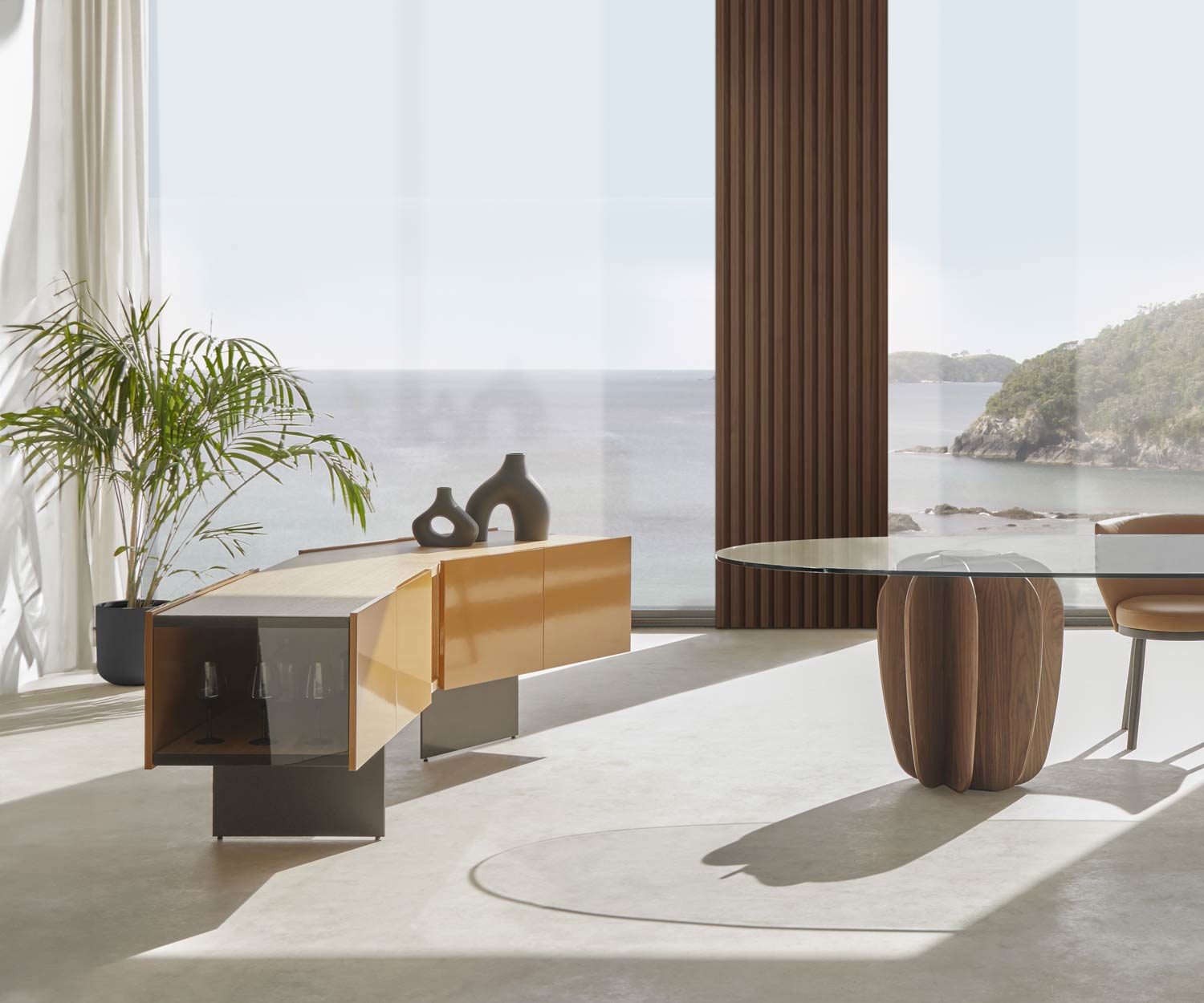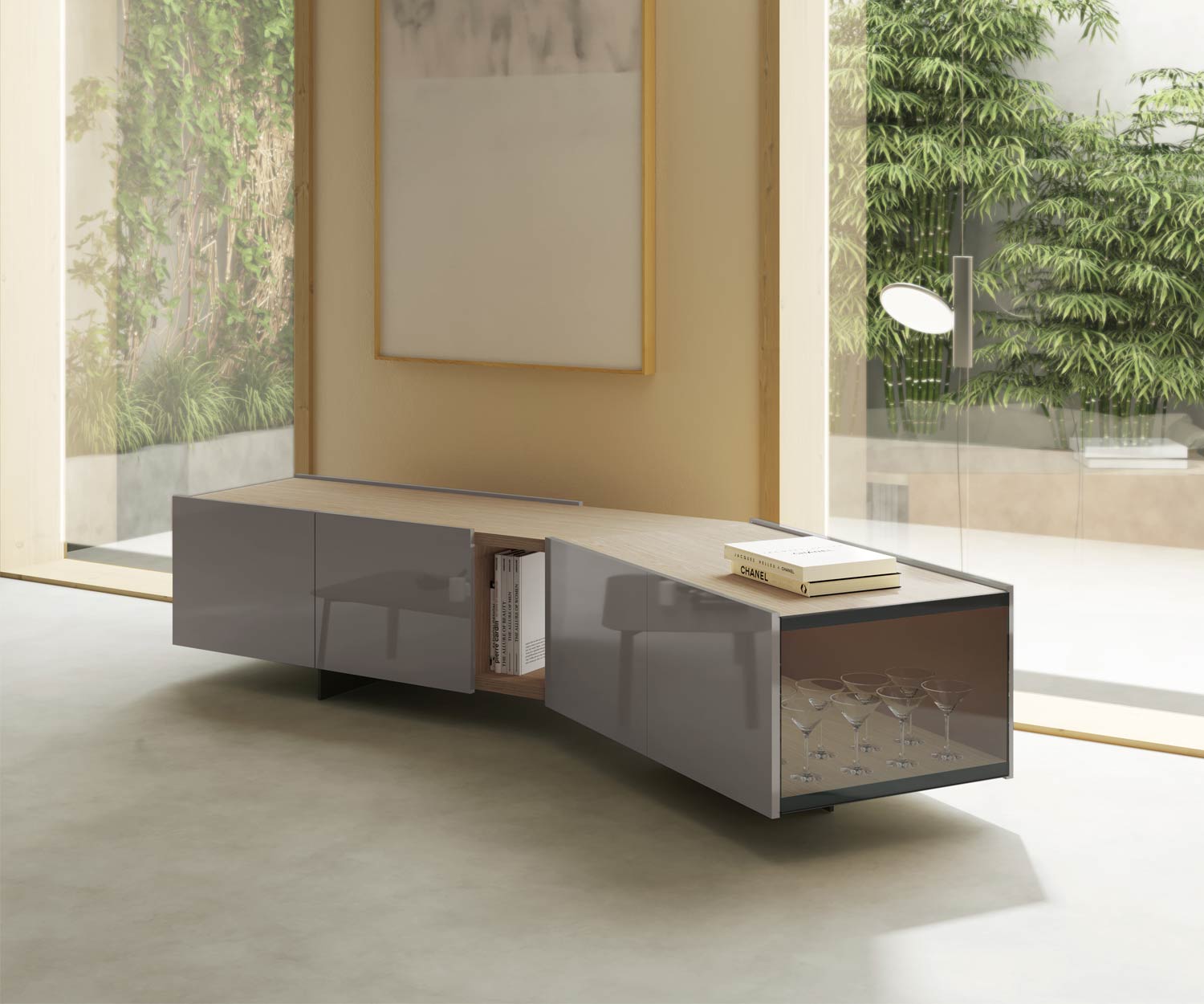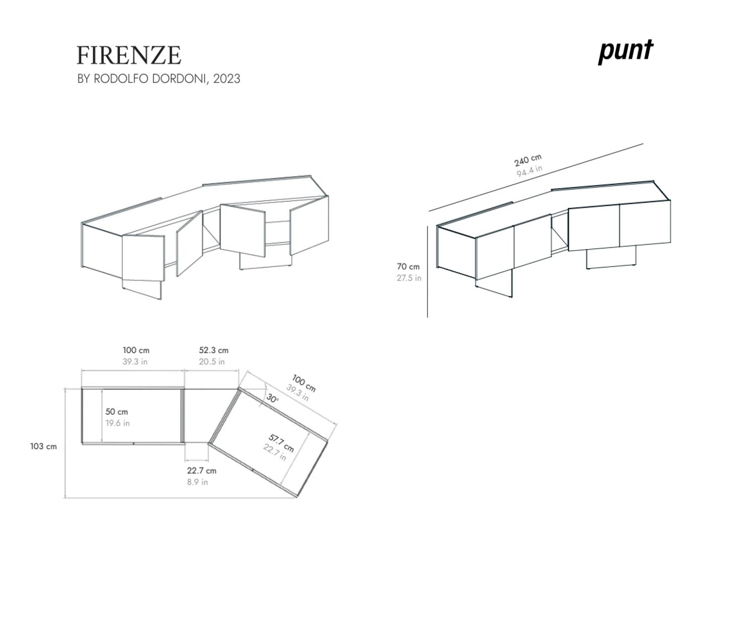 La particularité du sideboard Punt Toscana Firenze est son angle droit. angle obtus. De ce fait, ce design fait toujours entrer le meuble dans dans la pièce et le rapproche de l'emplacement mural classique. centre avec la table à manger et les chaises.